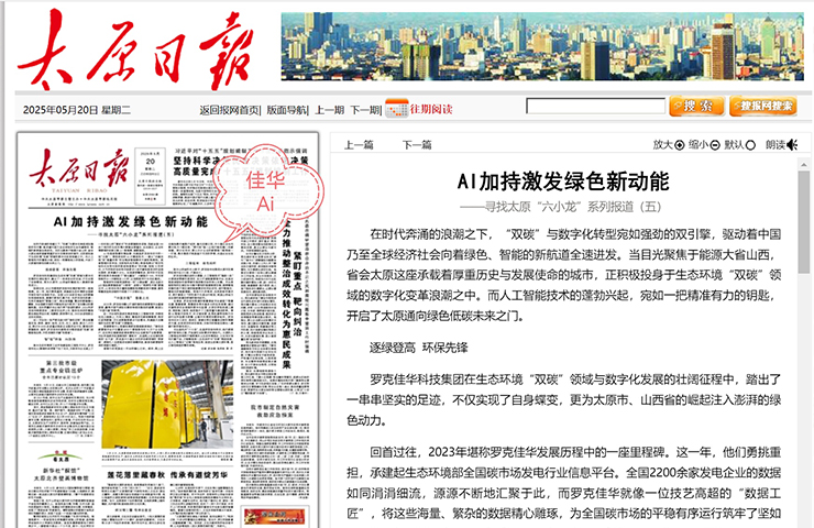 5?20丨《太原日?qǐng)?bào)》頭版頭條報(bào)道佳華:AI加持 激發(fā)綠色新動(dòng)能